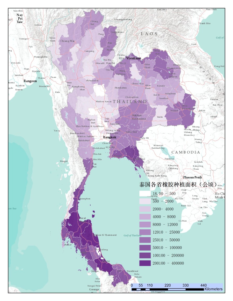 Figure 2. Thailand as the biggest rubber producer, produce 4.5millions ton of natural rubber, and 80% of Thailand domestic natural rubber is from Southern Thailand. Each polygon represents of a province in the map and the darker of the color represents the bigger area of rubber cultivation.